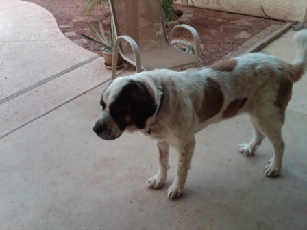 Angie: is a loving energetic Saint. When rescued from Maricopa County Animal Shelter she was listed as being 3-4 years in age. Her foster folks say she acts more like a 1 or two year old. Angie is smaller than a typical saint as she stands slightly taller than a Lab or similar large breed. When rescued she was painfully thin and while thriving and in good health, she could still comfortably add more weight. She has had a liter but is now spayed. Angie is currently living with another Cocker mix dog. She gets along well with other dogs. Angie is excitable but not aggressive. She loves to play with people and other dogs. She seems house broken and knows how to use a doggie door. Angie needs to find a forever home with patient companions willing to give her lots of affection along with lots training and discipline. 4/1/2009