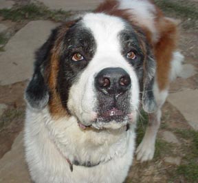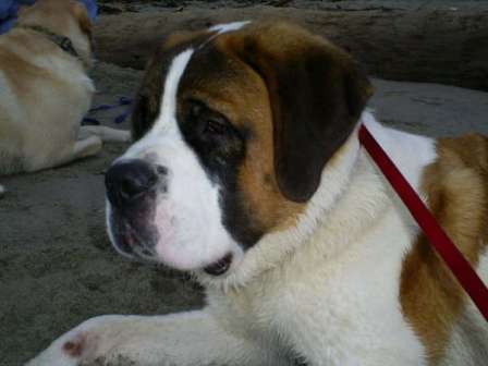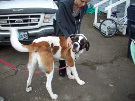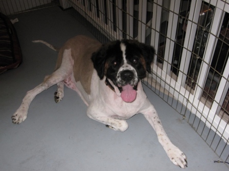 Abraham: is a calm, lovable Saint. He thrives on attention, but is also very happy to lie at your feet and sleep. He is not dominant and gets along fine with dogs, cats, and adores people! He is a good sized Saint, but could use some more groceries. Abraham knows basic commands and is good on a leash. He is currently being fostered in the DFW area of TX. 11/21/2009