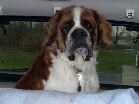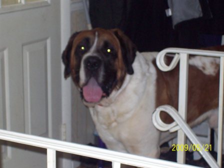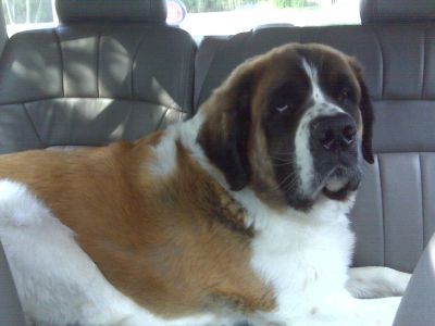 Nana: is a 4 year old short haired female Saint, who weighs approximately 130 lbs. She gets along great with my 3 cats, and 4 other dogs. She is a great dog to take for car rides. You would never know you had a dog in the car. She is a very sweet, loving dog. Nana needs to go to a home where there are no small children. 2/10/2009