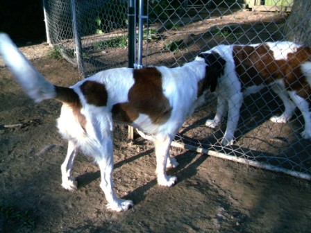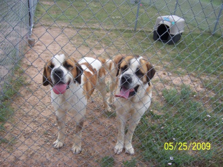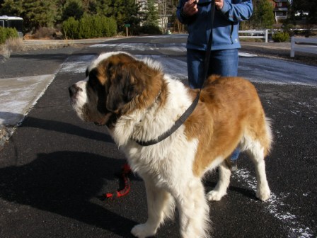Mongo: is a 2 yo (9/8/2007) neutered male smooth coat. He has some fear issues with strangers that we are working on. He is very smart and strong!! 150 pounds of hard headed dog. He responds well with a prong collar. He would need an experienced Saint owner. An Alpha owner. 11/4/2009 Mongo has graduated to my farm the Rescata. He is doing very well meeting our friends and neighbors. He’s learning to play. I still recommend he goes to an experienced Giant dog owner. 150 pounds of puppy running and play bowing at you can be an experience. His obedience refresher course has helped tremendously. 12/2/2009
