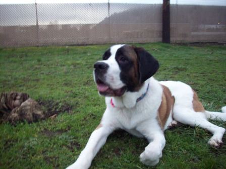 Bella: is a 1 yo (11-4-2008) spayed female. She was purchased by someone that didn’t realize she’d “get that big”. She was given to another person whose spouse felt like she was too much dog also. She’s great w/ kids and loves to be loved. Because she is still very much a puppy, her adoptive home must have previous Saint ownership experience. 12/20/2009