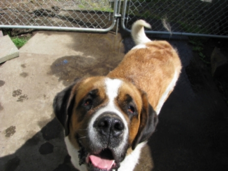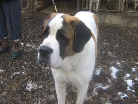 Willie: is a 5-year old neutered male Saint who is looking for his forever home. He is wonderful with children, he lived with 8 of them ranging in age from infant to teenager. He is housetrained and knows some basic commands. Unfortunately he is not a fan of other male dogs and needs to be kept separated from males. He is fine with female dogs of all shapes and sizes. He also lived with birds and small exotic animals and did fine. Although he may not be able to be as social as one would like outside of the home (i.e. his aggression toward male dogs) he would make a great companion to someone who has the room, preferably a privacy fence, and in return you will get 150# of love! 12/13/2009