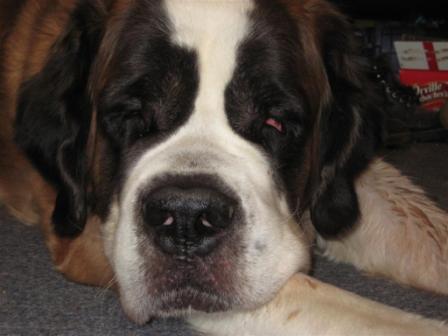 Baloo: Hi. My name is Baloo and I am an 8 year old with a lot of life and love in me. My owner had to give me up because he moved to an apartment and couldn’t take me. Do you have a couch or bed I can share? I like to take myself for walks on the leash and I am great at obeying commands. I live in a foster house with 1 male Saint, 2 female Saints, 1 female Golden Retriever, and 3 cats. I ride well in a car and look forward to going with you anywhere you go- and I don’t make a mess if you leave me by myself!Take a look at my picture and if you could please give me a chance, I can offer you the rest of my years being dedicated to your every whim! 1/4/2009