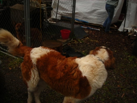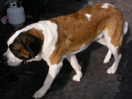 Ziggy: He is a young three year old neutered male Saint. He is very tall, came in 50 lbs under weight and has not stopped eating since he came into rescue. Ziggy has gained about 30 lbs and needs another 20 lbs. His coat has become a beautiful rich red and white. He is a very sweet boy, has make a very good housedog, does not like to be in the yard alone, needs a 6 foot fence or he will go over to find his family. Also crate trained, likes his crate when he can not be in the house. He prefers to drink the horses water, learned that all on his own (photo). He likes to scratch his back himself (photo). A quirk of his is to walk between your legs so watch out. He gets along with dogs and cats. Has basic obedience training. Just a wonderful all around family dog. 2/2/2009