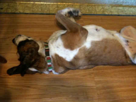 BRUNO 3: Bruno’s a roughcoat young fellow who’s only 17 months old. His vaccinations are up-to-date and he was just neutered. (He sure was surprised to learn what THAT entailed.) He’s been microchipped, is HW-negative and he’s housetrained. We think his half-mask is quite striking. Don’t you agree? Brunie plays nicely with most other dogs, and he even tolerates cats. His favorite goodies are hot dogs. Heck, this boy loves ANY people food (though we don’t recommend human goodies except as a very special treat when he’s been especially good). He’s not real crazy about thunder but doesn’t make much of a fuss — He just hides til the storm passes. He prefers being indoors with his human family, preferably getting tummy rubs. Brunie’s ideal home will have a fence, perhaps another dog or a cat, and kids over age 10 or so. He’s an affectionate boy who loves being hugged. Are you looking for a first-class cuddler? If so, Brunie might just be your boy. 12/29/2009