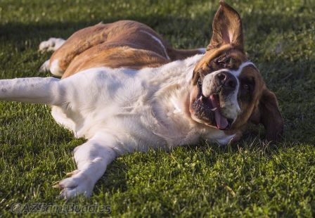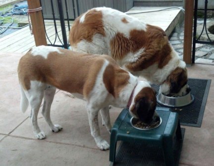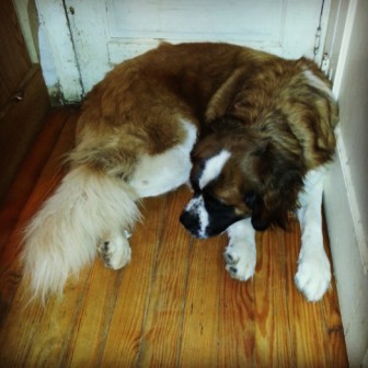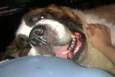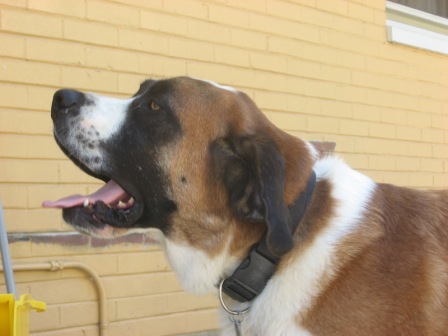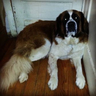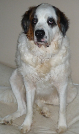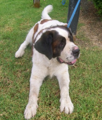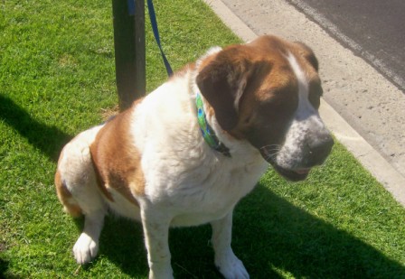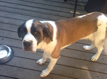 Bart: is a 7-year-old (??), adult male neutered Saint. He weighs about 150 lbs, is current on his vaccines but is heartworm-positive. Easy-going and mellow, Bart is a big old teddy bear who charms everyone he meets. One of our older Saints, Bart is definitely an indoor dog who enjoys frequent naps, mealtimes and short walks in cooler weather. Bart’s most strenuous activities are periodically patrolling the backyard and the “happy dance” he does at breakfast and dinner. Bart has a slight limp due to arthritis or early dysplasia. Bart currently lives in a multi-dog household and does well with other dogs. While not the brightest boy, Bart makes up for it with his sheer lovability. Bart is looking for a relaxed, peaceful home in which to spend his golden years. 1/9/2013
