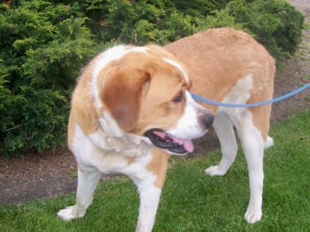 Rocky: is a nice boy who came to rescue from a bad set of circumstances. He was tied outside and feed 1 can of catfood a day. A nice lady found out about Rocky and had the owners release him to her. She in turn gave Rocky to Saint Bernard Rescue. We as always are delighted to help him. He came in very thin and now has gained 20lbs. Since in fostercare we have learned many things about Rocky. He is very loyal, eager to please, and a couch potato! He is good with other dogs and enjoys children. He loves attention and will make a wonderful buddy for someone. He rides well in a car and enjoys a long walk. He has nice manners and listens very well. For a dog who was tied outside essential starved and probably not treated well he is a testimony to what "Mans best Friend" is all about. 11/4/2013