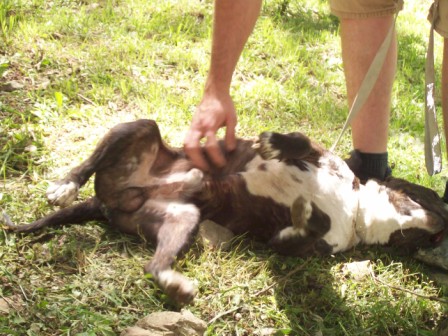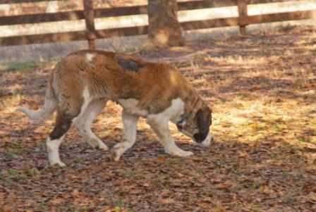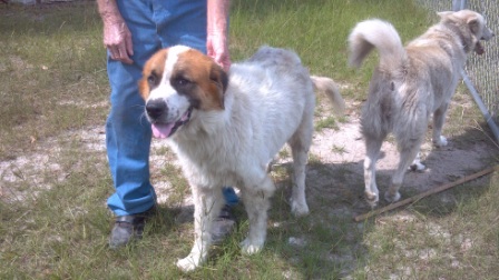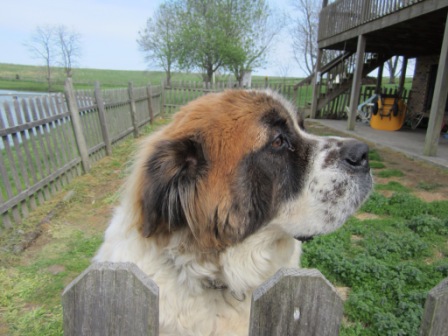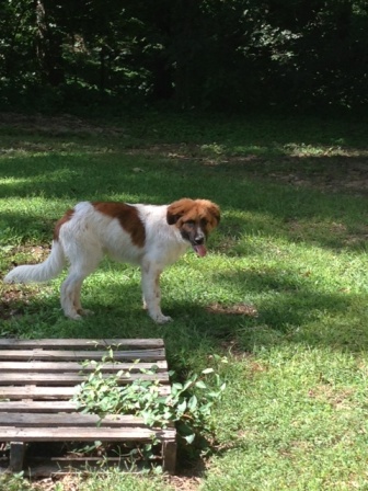 "Bear": is a 6 yr old neutered male shorthair saint that is finally learning who he is. He is great with kids dogs and horses. Loves positive reinforcement but not a big eater. He kennels and is house broke. Stills pulls on a leash but we are working on that. He has a happy bark that melts your heart and let’s you know how much he appreciates attention. When I first met him I thought since his old owners claimed he is a runner I figure I had my work cut out but a little attention and some training and he is the perfect farm hand. 4/15/2013