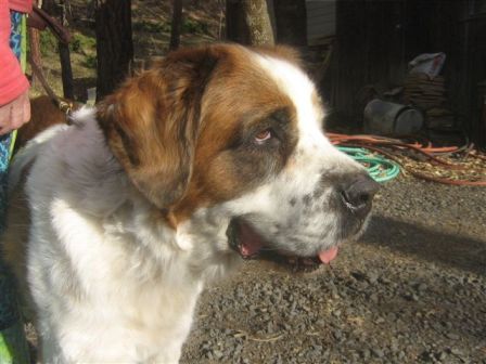 Bruce: is a 3 yr old rough coat neutered male who was surrendered when his owner moved to an apartment. Bruce is a friendly guy once he gets to know you. He seems to take awhile to warm up to women but once he does he wants to be by your side at all times. He is a great indoor dog and is housebroken and so far doesn’t want to be on the furniture. He has good manners in public, loves to take walks, car rides and playing ball. He knows basic obedience. He came to us a bit underweight but is now in the normal range. He is up to date on his vaccinations and will have to have ongoing care with his eyes although he shouldn’t need any surgeries. This one is an excessive drooler, more than the average Saint so a stock pile of bibs will come in handy. 3/2/2013