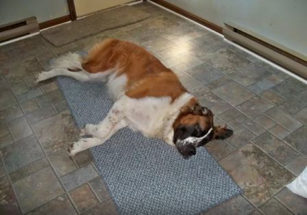 MAMA: is an amazingly sweet smooth-coat 4-year-old female Saint Bernard. Being a short hair dog, she does not have the issues of keeping her fur from becoming matted. She is a big girl, last weighed in at 130 pounds. She loves to walk on a leash and does very well unless she catches sight of a deer or squirrel or a ground hog and then she pulls and wants to run. She is easily distracted and returns to her normal walking. Mama would benefit from having a fenced yard. We have had her almost a year and do not have a fenced yard, so she spends a lot of time on a leash. For some strange reason, she does not like to have her picture taken and so these pictures are from last year but she still looks the same. She is sweet and loving. She is friendly with everybody and with other dogs. She has not had any experience with cats. We are heartbroken about having to find her a new home. Our family circumstances have changed and we are not able to take her with us. She knows sit and down. She is extremely quiet in the house. She has only barked twice in the time we have had her with us. She loves sleeping in bed with us. She also makes her rounds, sleeping on our granddaughter’s bed, our love seat/hassock and our bed. We really hope that somebody full of love will take her into their home and love and spoil her as much as possible. 1/12/2013