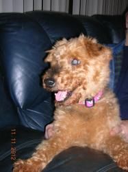 Izzie B: Welsh Terrier I was in a shelter, had a place to sleep and eat, but it was really scary! Then a lady came and looked at me and took me for a ride in a car, she gave me a bath and took me home. There were 2 HUGE dogs there that wanted to play with me, but I was afraid at first. Black dog is always wanting to play with me but I’m a lot older than he is and can’t play as long. I do like to take walks, ride in the car, play with some toys (obsessed with tennis balls), like any terrier. I also like to sit in your lap and cuddle. I’m looking for a forever home to love me! Don’t overlook me just cause I’m a senior, and I’m deaf. I’ve got lots of love to give! (I can give kisses too!) Spayed/Neutered, Up-to-date with routine shots, House trained, Special Needs, Primary color Red Chestnut or Orange, Coat length Wire Small, Senior, Female. 11/9/2013
