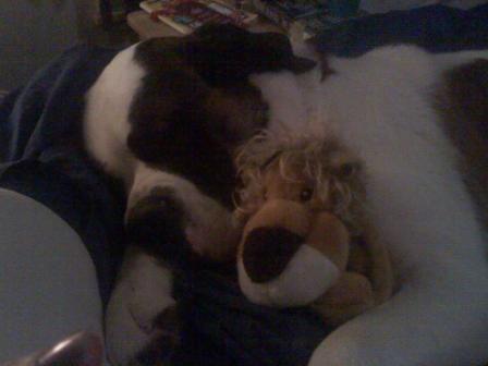 Holly: Holly is a young and very energetic ~18 month old. She came to us and was not housebroken, but she now knows she goes outside and has her very favorite and ultra private spot in the backyard. She also takes a little time to get the spot just right, so please be patient. She is learning to walk on a leash but still is learning because the world is filled with such great things to smell and chase. She has the softest fur of any Saint. It is a rich, lush russet brown. She loves to play tug of war with one of her foster sisters and when the tug is over, she loves to frolic and take turns chasing or being chased. She has been great with anyone she has met on a walk and gets along with her two foster sisters. When she came to us, she did not know how to climb or descend stairs, but the second night she came to bed with the family and has her favorite spot by the door. She loves to have the top of her head scratched before she lies down to go to sleep. Watch out! She snores when she sleeps on her back, with all four legs in the air. She is young and still filling out and learning, like any teenager. 3/12/2013