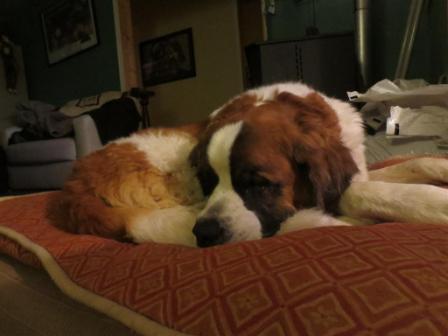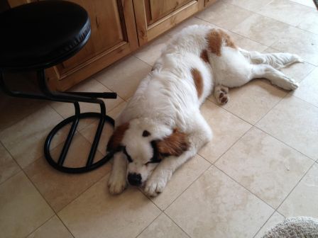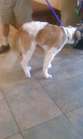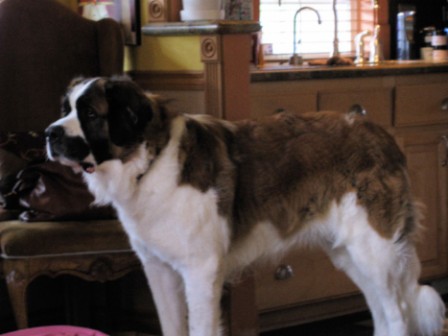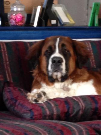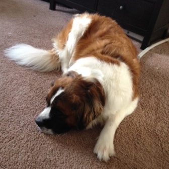 Kenya: is a smaller 6 year old female Saint Bernard and was only 80-90lbs when she came to us. She LOVES people wants to be with people and wants to please people. She is having to learn how to properly meet new dogs; which she is doing much better at. She ignores the cats completely but may chase if they were to run. She loves to ride in the car and hang out at work with us all day or relax in the yard with a canine friend. She would be a fantastic family dog as an only dog or with a family with other dogs with proper introduction. She is good indoors with or without a crate and sleeps through the night. She has been a joy to have with us and has learned everything we have presented to her very quickly. 2/12/2014