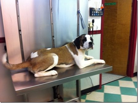 GRIZZLEY: he made it to rescue and has been neutered and UTD. He is ready for adoption Tuesday, Feb. 4th! He is all that we were told he was – AMAZING AND SWEET and curious and the typical cartoon version of a Saint Bernard sans the extra slobber and giant appetite! He is so kind and needing of affection after being dumped by his owner. He is a really charmer and I high quality Saint to boot. Pls Pls consider adoption this wonderful man and kind heart fellow who loves cats, ducks, kids, humans and other dogs. 2/9/2014