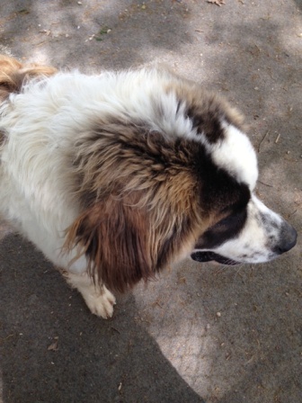 Poppy: is a sweet young spayed Saint mix. We guess she might be mixed with Collie or Shepherd. She weighs 32 lbs currently, and is somewhat underweight. Poppy is housebroken, and loves to play. She came into rescue with an eye infection, and demodex mange, but those are on the way to being corrected. She is on heartworm and flea prevention, and is looking for her new forever family. If you want a pup more energetic and smaller than a purebred Saint (no drool with this one!), Poppy is your gal. 1/2/2014