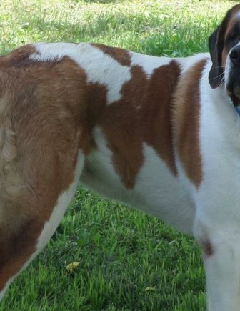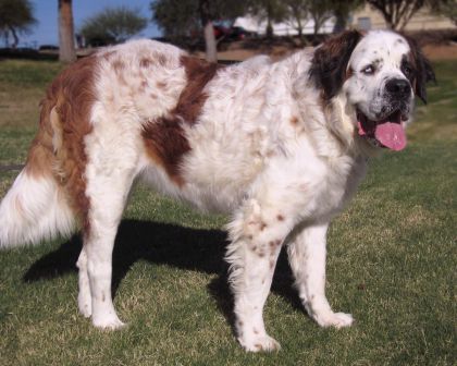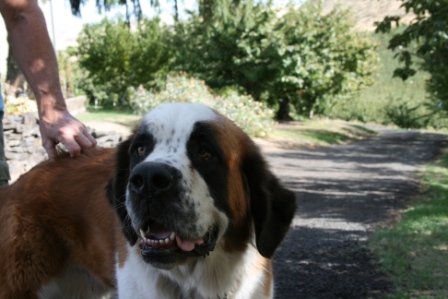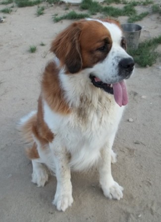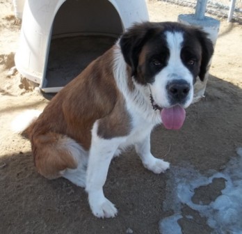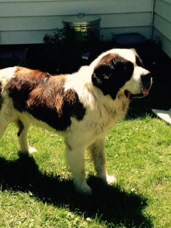 Bauer: is a 2.5 yr old, short haired male Saint Bernard. Weighs in at about 150 lbs. He loves to drink from the hose. Bauer is an inside dog – “couch potatoe”. When left outside, he does like to bark. He is an active youngster who loves to play with ropes, balls, squeaky toys and any stick he can tear apart. He is having some summer allergy problems so requires a daily allergy pill to help him out. He is fine around children but a cat is not recommended. Some obedience classes would be in his best interest. He is a great dog and any family would be lucky to get this big guy. 9/20/2015