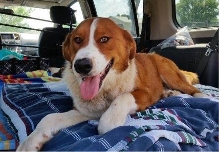 ANGEL: HAS ARRIVED IN BOISE AND IS SAFE IN FOSTER! Thank you to new foster parent Hetty for taking Angel in. Angel is a 4 year old Saint Bernard/Retriever mix, weighing in at 85 pounds. Hetty has this to say about Angel: Wow this girl is amazing! I came home on a break to check on her. I apparently missed part of the front latch on the crate and the front folded down. She was sacked out in the living room. The cat was sleeping in my sons room happily. She doesnt bother the trash, gingerbread houses on the counter, turkey soup cooking in my crockpot. She will sit, stay, walks on a leash perfect. She sorta wanted to chase the first car that passed but I said no and she just stopped and walked with me. Truly amazing dog. She was very happy to see me when I got home, whined a little at my bedroom door when I went in to change out of work clothes-I think she was just nervous because I barely got home and then shut the door,she wants to be near me. I don’t think she probably does that normally, she sprawled in the living room while I was in the kitchen getting my tea. Quite a girl! 2/12/2015