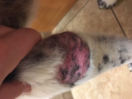 FERGUSON: is an amazingly sweet, mellow 5 year old Saint Bernard/Landseer mix weighing in at 130 pounds. Unfortunately he was under the care of some owners who didn’t take very good care of him and let him get to this point, missing half of his hair, yeast infections, extremely severe ear infections, belly skin hanging down like a mama dog that’s been nursing for weeks, lethargic and mild muscle atrophy. Luckily they surrendered him and we scooped him up, immediately taking him to our vet. Turns out he is just hypothyroid, which means his thyroid isn’t working properly. He has now been in our care for 2 weeks and is perky, alert, his skin is soft and he is feeling so much better! His ears are also much better. Ferguson has a little ways to go, but his hair will grow back and he will be back to normal in no time! Ferguson is great with other dogs, cats, kids and loves everyone. He enjoys sun bathing, and short walks…maybe working up to longer walks as he feels better. Ferguson will need thyroid medication probably for life, but it is inexpensive and easy to administer. 4/12/2016