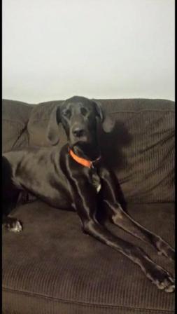 Thor: is a 1 year 3 month old Great Dane. He came to us because he was knocking the kids over, but he is a big overgrown baby who loves everyone and is excited and wants to play. He appears to have had very little training, and is somewhat timid at first, but will quickly warm up. Thor is house trained, does well with other dogs, cats unknown. 10/17/2016