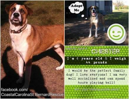 Chester: is a Tea Cup Saint Bernard (only kidding) he is a Saint Mix who weighs in at about 44 lbs and is 6 years old. If you are looking for all the good traits of a Saint Bernard but in a smaller package here is your guy. 4/25/2016