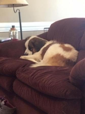 Roman: is one of eight Saints that came to us when Animal Control shat a breeder down. Like all the others he is under weight and was not sure about all the new things he was seeing. When he came to us he went straight to the Vets to get neutered and start his heart worm treatment. Now he is on the mend and has learned that a couch sure beats the kennel he was in. Roman is gaining weigh nicely and fit into his foster home very quickly. So if you are looking for a mature Saint that will be just happy to be with you than here he is. 2/25/2016