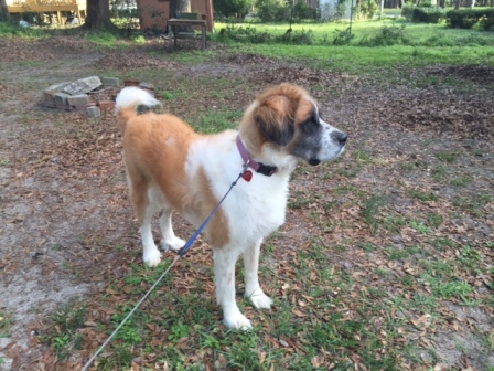 Knucklez: is a neutered l/h 10yr old male. He is possibly a Great Pyrenees/St. Bernard mix. Knucklez was turned over to rescue from a shelter after his could not find housing that would allow a large dog. Knucklez had some health issues that have been taken care of. Knucklez has some territorial issues that need to be worked with. He is very protective of his home and people. 8/22/2016