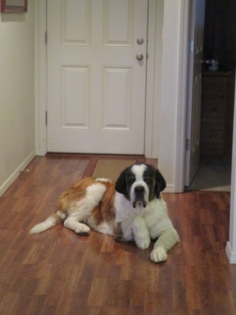 LOKI: is a 5 year old GORGEOUS, sweet, loving, goofy Saint Bernard. He will lay at your feet, chew on bones, and be perfectly content. He would enjoy another dog to play with, but not too small as he can get a little rough…no kitties either…they are way too fun! He really is just a big giant baby, that is curious about everything and wants to be involved in everything you do. Someone that works from home, or is retired, or even someone that could take him to work would be ideal as this guy loves to be with his people. He has gone to doggy daycare and done amazing! I cannot say enough good things about this boy. We will be beyond picky, so please be prepared to answer many questions. All animals in the home must be fixed. A fenced back yard is a must. 4/5/2016