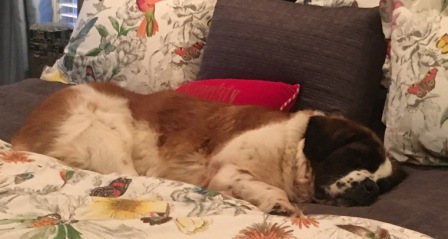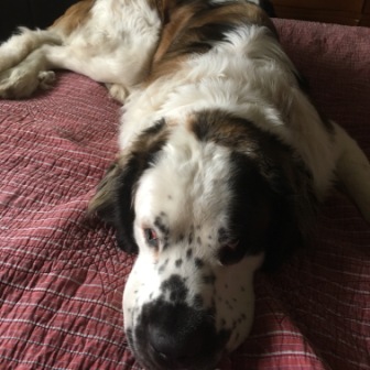 Pablo: My name is Pablo. I’m one of the new additions to Oregon Saint Bernard Rescue. I am an 8 year old longhair male. I’ve been an outdoor dog most of my life, so I am just learning some house manners. As you can see in the picture, I am pretty okay with it. I like other dogs, as long as they don’t challenge me and have been good with the ladies. I am definitely not a cat-person. No way. I’ve been around kids, but I’m getting up there in years, and it would probably be best if there were no little ones around on a regular basis. I’m also not too fond of vets with hypodermic needles. They freak me out. I like car rides, walks, baths, being brushed and petted. I know basic commands like sit, lay down and stay. The nice folks at rescue are going to put me on some high quality grain free food, fix up my icky nose, work on my allergy and skin neglect issues, and get me neutered. I’m really looking forward to that! I could really use some joint supplements to keep me on the move. If you are interested in helping me out, Oregon Saint Bernard Rescue has an Amazon Wishlist that you can order from. They would like me to go on Cosequin DS. (You can find this under Your List/Find list or Registry/enter: Oregon Saint Bernard Rescue). Currently, I am in foster until I get all fixed up.7/24/2017