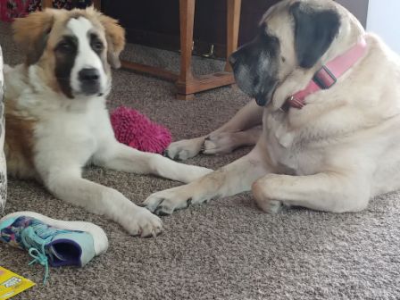 Bella: and Bear: her brother Bear (born Sept 2017) came in to our rescue when there family could no longer keep them. Both are happy loving puppies whose only job is to play eat and sleep and boy do they do that well. They are both tall and still growing. So if you are looking for a big friendly dog here they are.8/16/2018