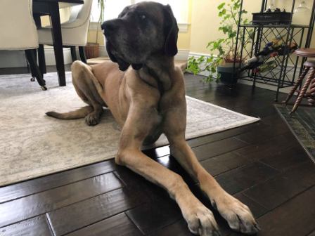 Bonnie: is a 2 1/2 ish year old Great Dane. She’s so loving and sweet, a little timid, but warms up, great with dogs and kids. Her biggest issue is her separation anxiety. If left alone at all she will chew…and chew. She is on Prozac which has helped some for sure, but she will absolutely need to be muzzled and crated (without the muzzle she can break out of the crate) when left alone. She would do best obviously with someone who is home all the time, or can take her with them. She will pay you back a hundred times over with love for your patience! This poor little girl has been bounced around and was recently returned to us again for chewing. Please folks, when we tell you she needs muzzled and crated, we mean it. It’s not cruel or mean. It’s for her own good so she doesn’t chew electric cords, or destroy your house. 9/7/2018