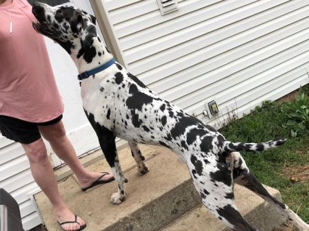 Wilson: is an almost 1.5 year old Harlequin Great Dane. He is FULL of energy and really needs another big playful dog in his new home. Wilson is a really tall dog and weighs in at about 130 pounds currently. Wilson is a big love bug, does the typical Dane Lean, and will sit his butt on your lap if you let him. He is house trained, crate trained, is being neutered in the middle of April, fully vaccinated, and microchipped. Wilson’s ideal home would have an active family that will take him out to do stuff, has another big playful dog, big fenced yard, and a family that will include him in their day to day. He will definitely need some obedience work, and he is a counter surfer. Wilson is a VERY BIG boy so older kids (probably 6 or older) would be best. He takes treats super gently! We adopt to within 12 hours of Boise, Idaho. Fenced yard required. All animals in the home must be fixed. 7/9/20181
