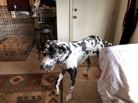 Atticus: is a 1 1/2 year old Great Dane. Good with kids, needs a proper into to other dogs. Great with cats. 2/5/2018
