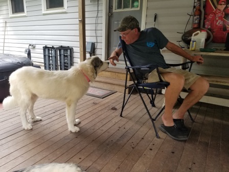 Pace: is 68 lbs 4 to 5 month old Great Pyrenees puppy. Pace has Merle markings (first I have heard of this). Sweet shy for about 2 minute and then he all about pets and treats (he is a little more shy than his sister Stardust). 8/16/2018