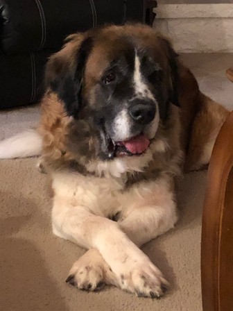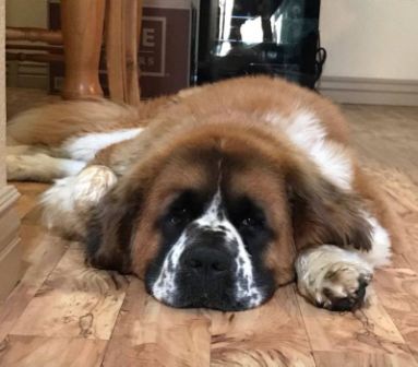 Bear: is a 4-6 year old male Saint, looking for his forever home. Typical Saint, Bear just wants attention and love from his people. Bear has been a very loved member of his family and this is not an easy decision for them. He is house trained, and just a cuddle bug. 6 foot fence required as if he gets out he will take off. Bear loves to sit in your lap if you let him ♥ Bear gets along with dogs and kids. Unknown on cats. He does fine while his owners are at work and likes to close himself in the bathroom, it’s his personal den. Bear will get into the trash if he’s able to. 6 foot fence absolutely required (NO exceptions), all animals in the home must be fixed, and we only adopt to within 12 hours of Boise, ID. 2/18/2019