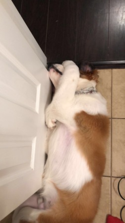 Reggie: is a 1 1/2 year old female Saint Bernard mix (no idea on the mix). She weighs about 100 pounds. It was clear she had puppies before she came to us, but she is now spayed! Reggie loves other dogs, cats, and kids. She really needs a younger playful bigger dog in her new home to wrestle with. Reggie is house trained, crate trained, and does fine when her fosters go to work during the day. Reggie is a cuddler, and just the sweetest pupper ever. Everyone who meets her just loves her, and she loves them. 1/31/2019